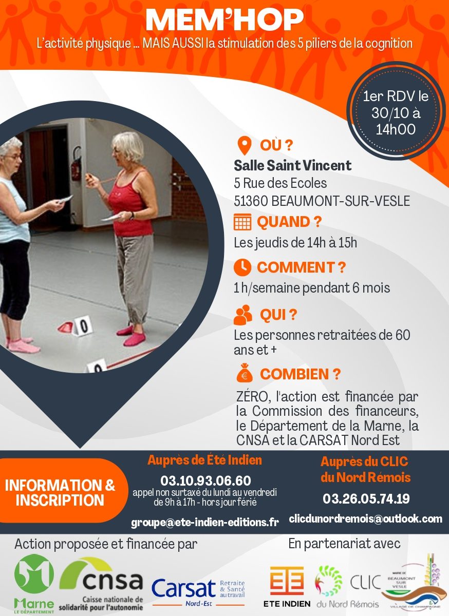 Fabien, enseignant diplômé en activité physique adaptée au sein du collectif Eté Indien, sera présent le jeudi 30 octobre prochain dans la commune de Beaumont-sur-Vesle, Salle Saint Vincent, 5 Rue des Ecoles à 14 heure pour présenter le programme d’activité physique et de stimulation cognitive intitulé « Mem’hop » en collaboration avec « La Clinique du Docteur Memo ».